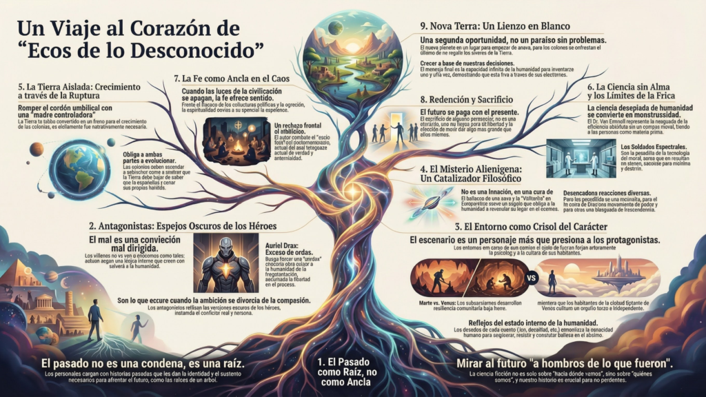En un futuro donde la supervivencia depende de la lógica y la tecnología, personajes cómo Francisco Velázquez o el enigmático Rhett Colson descubrirán que el verdadero desafío no está en navegar por el Sistema Solar, sino en cartografiar los abismos del corazón. Bajo la premisa de que “el pasado es raíz, pero no condena”, esta obra explora la redención, el sacrificio y esa esperanza imperfecta —la estel de la que hablaba Tolkien— que brilla con más fuerza cuanto más densa es la oscuridad.
